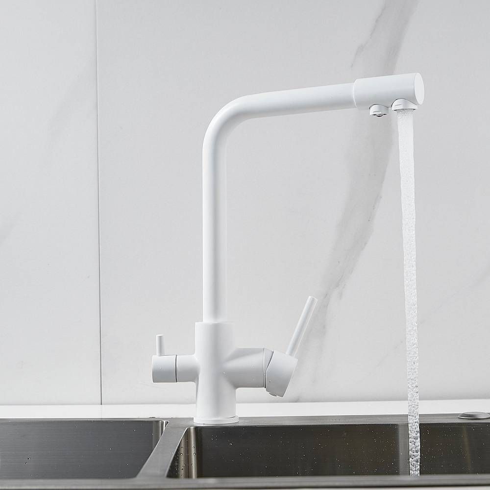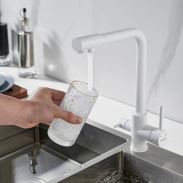 Во-первых, матовый белый цвет подойдет к любому дизайну кухни и будет гармонично смотреться в любом интерьере. Во-вторых, поворотный излив позволит легко настроить струю воды под любые ваши нужды, а встроенный канал для питьевой воды облегчит процесс фильтрации и подачи воды.