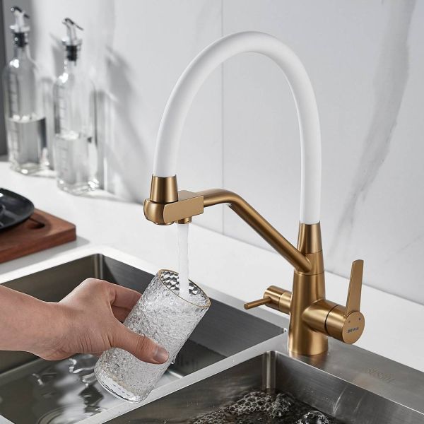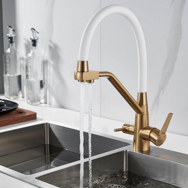 Смеситель для кухни с подключением фильтра и гибким изливом Shevanik S968G, золотой сатин.Управление: рычажное.