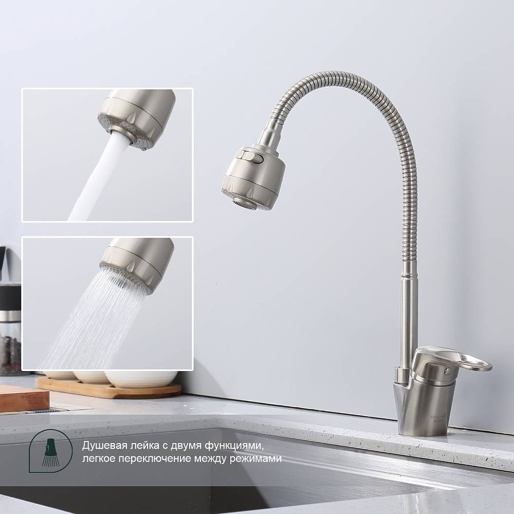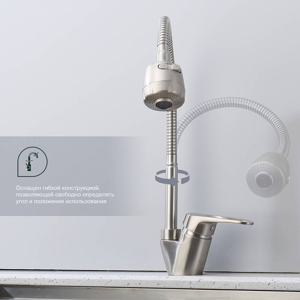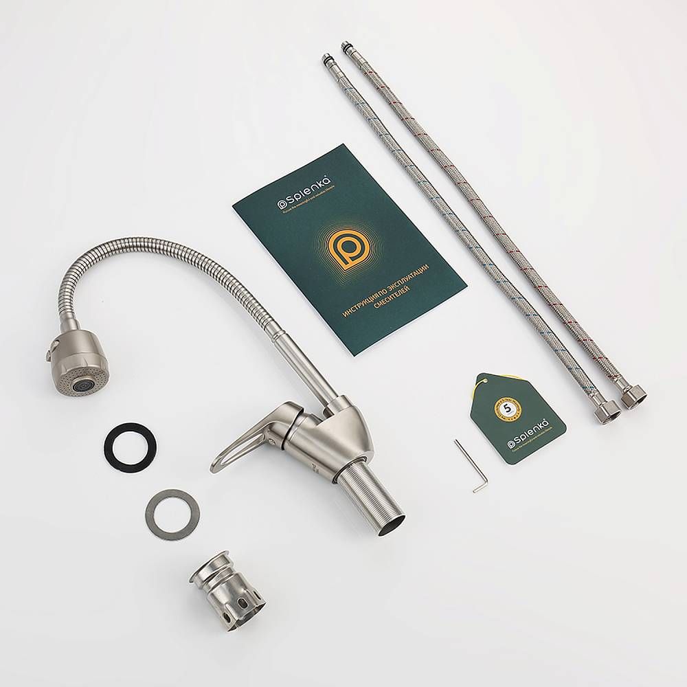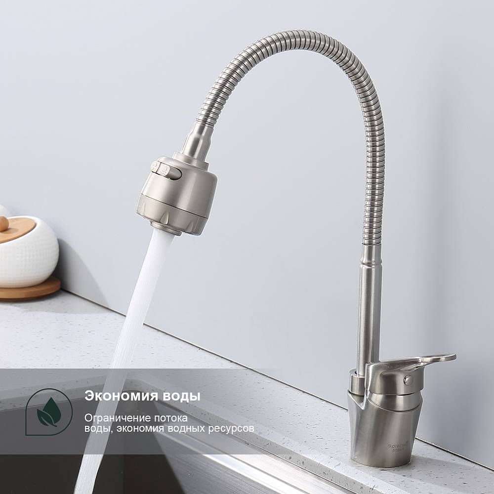 Смеситель для кухни Splenka S202.47.05. Цвет: сатин. Кухонные смесители торговой марки SPLENKA широко известны своей надежностью. Строгий контроль качества сопровождает весь цикл производства, включающий материалы и технологии по немецким стандартам: аэратор позволит сэкономить до 30% воды и обеспечит равномерный поток воды. Душевая лейка с двумя функциями, легкое переключение между режимами. Смеситель для кухни имеет разумную высоту, удобную для наполнения водой больших емкостей. Поворотный излив позволяет с большим удобством пользоваться им на кухне. Встроенный аэратор эффективно фильтрует примеси и уменьшает шум от импульсов воды. Гладкая внутренняя стенка обеспечивает мягкий поток воды. Высококлассная технология делает поверхность яркой и блестящей. Подходит к кухонным мойкам практически любых размеров и форм. Быстрый монтаж и простота в обращении позволяют экономить время до 50%. Гарантия на сантехнику от производителя – 5 лет на смеситель и 2 года на покрытие. Комплект включает инструкцию по установке и гарантийный талон.