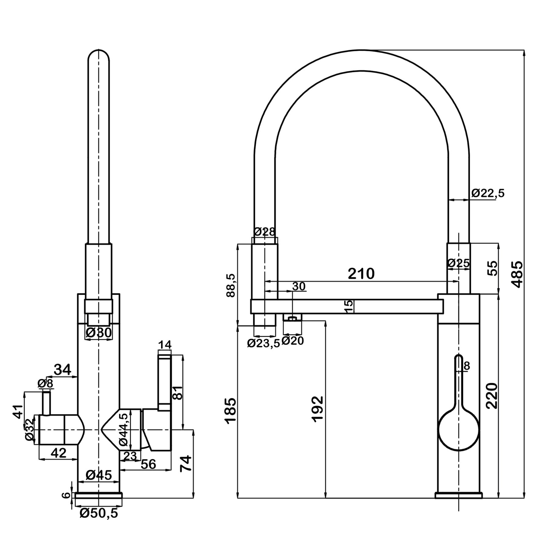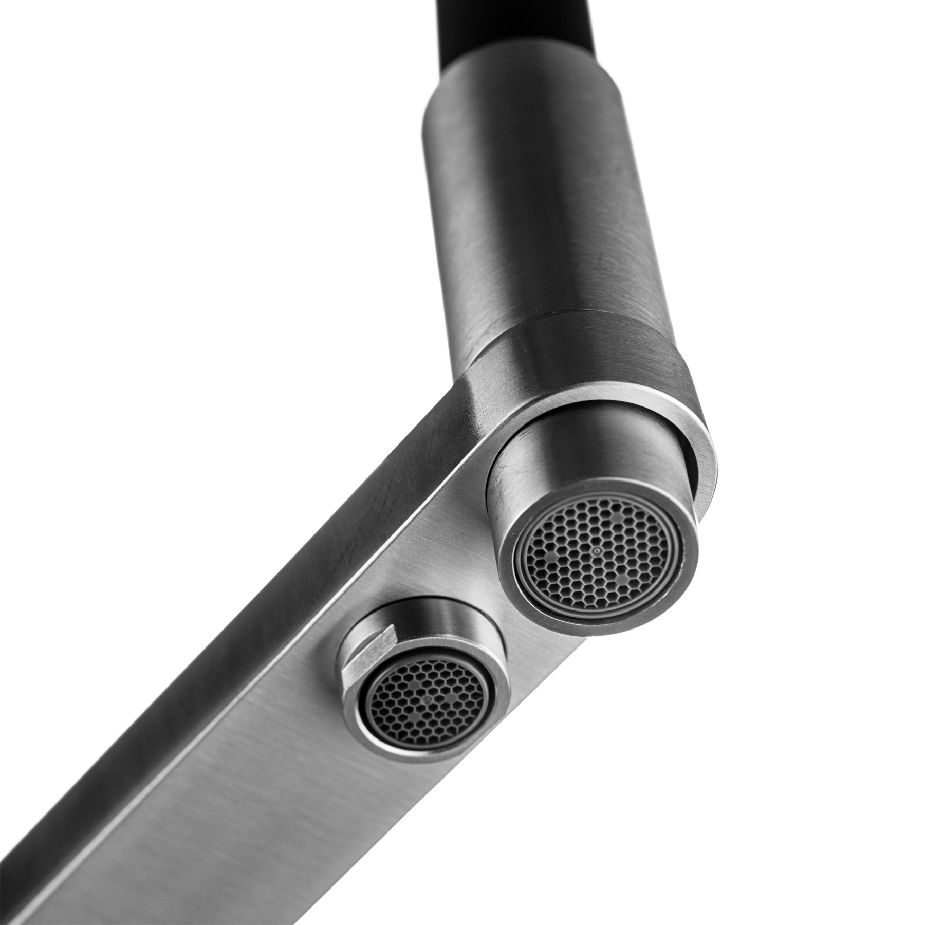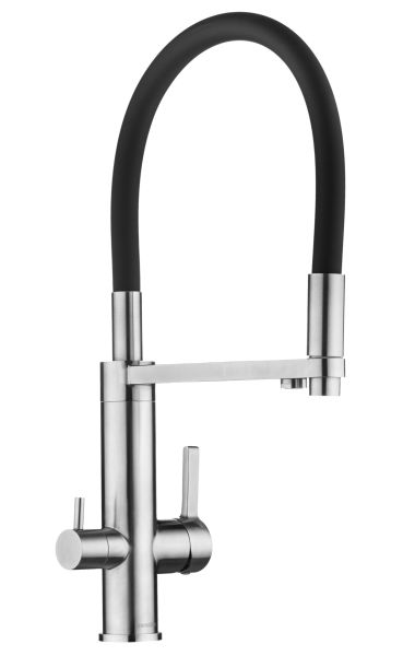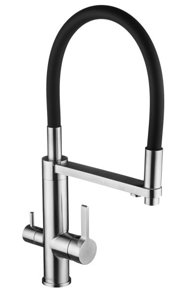 Кухонный смеситель для фильтра с гибким изливом 2 в 1Излив с поворотом 180 градусов.Изготовлен полностью из пищевой нержавеющей стали (SUS 304).Изолированный отдельный канал для фильтрованной воды.Керамический картридж Sedal.Аэратор Neoperl.Гибкая подводка SoftPEX.Цвет излива: черный