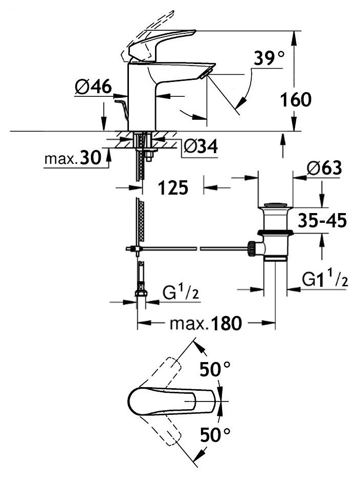 литой рычагмонтаж на одно отверстиеаэратор M 24 x 1керамический картридж с ограничителем горячей водыгибкая подводка G 1/2система быстрого монтажарычажный донный клапан 1 1/4Италия10 лет гарантии