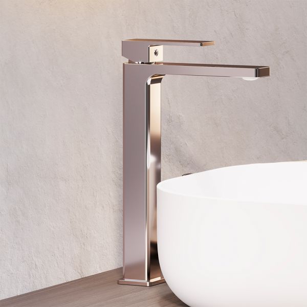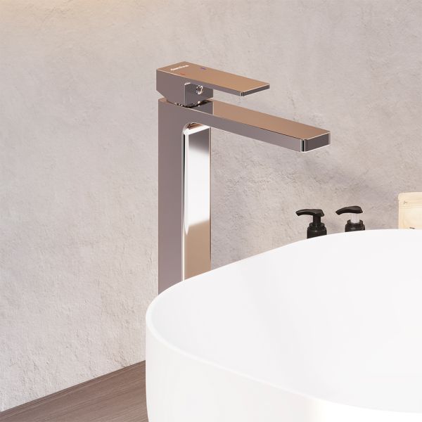Смеситель для раковины Damixa Gala 530250000 хроморпус смесителя 1 шт.; подводка для воды 2 шт.; комплект крепления 1 компл.; инструкция изделия. Хромированный, высокий умывальник для накладной раковины, строгие прямоугольные формы