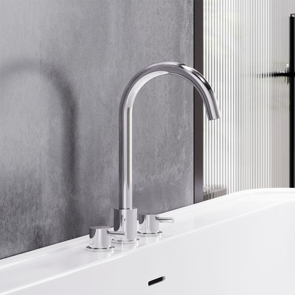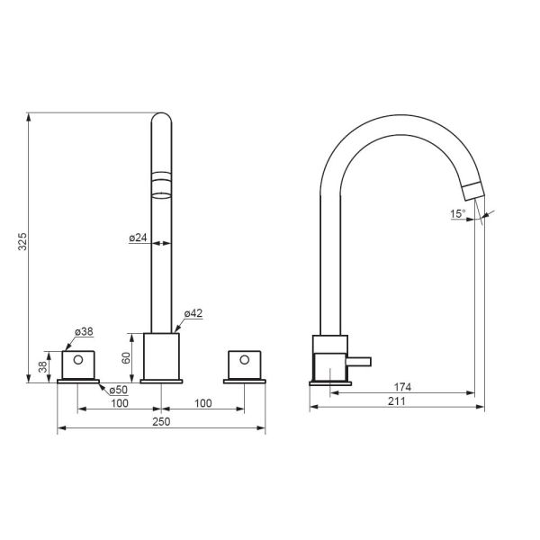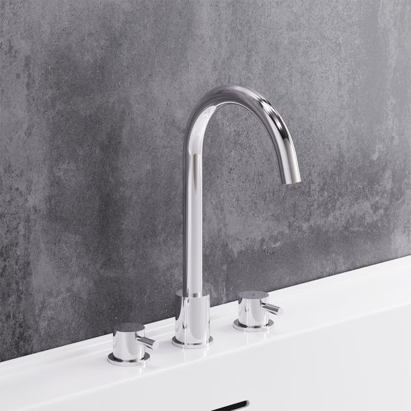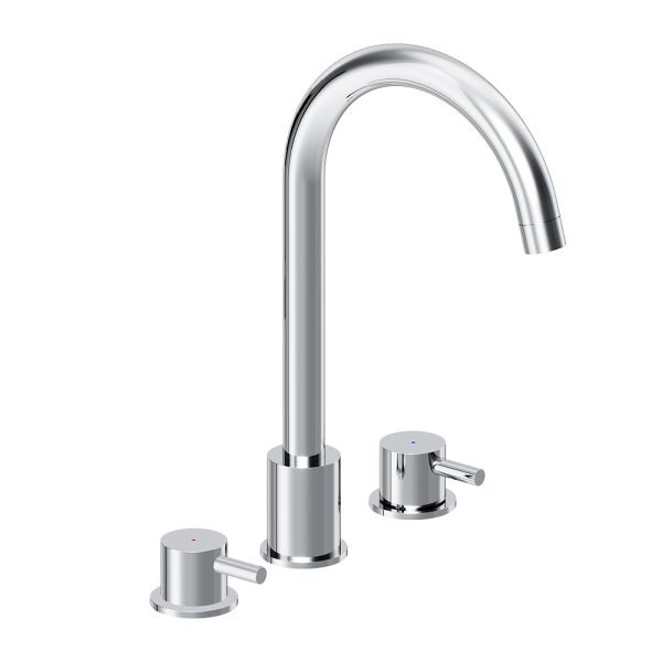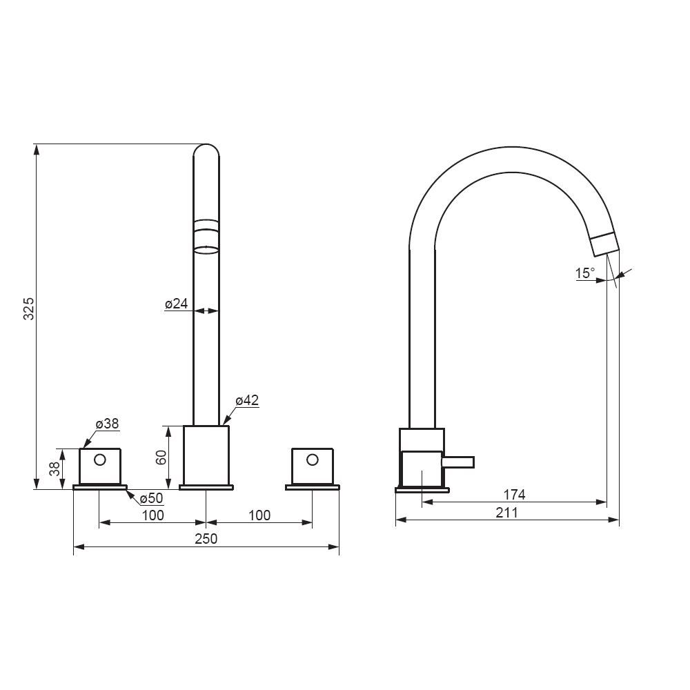 Корпус смесителя 3 шт.; излив 1 шт.; ручка 2 шт.; комплект соединения 1 шт.; гибкая подводка 2 шт.; инструкция изделия. Хром, врезной смеситель на раковину, состоит из трех отдельных секций, горячая и холодная вода поступает из отдельных секций, температура воды регулируется отдельными ручками независимо друг от друга, как на ретро смесителях