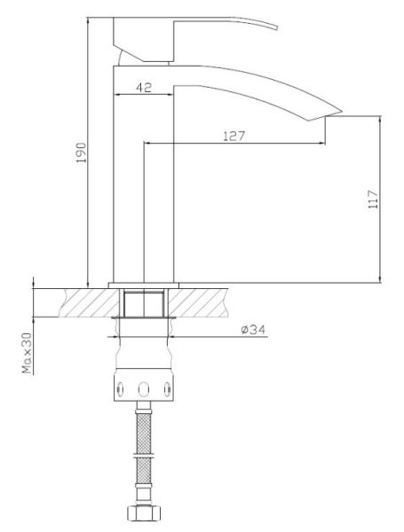 Смеситель для раковины Haiba.Изготовлен из нержавеющей стали.Картридж 35 мм.Максимальная глубина монтажа 30 мм.Диаметр монтажного отверстия 34 мм.