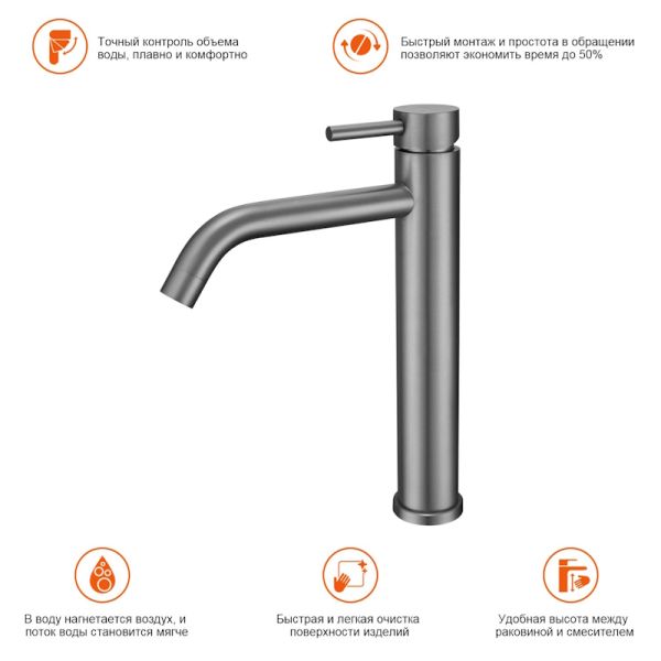 Смеситель для раковины высокий Prohanss P31.15.09, графит — это идеальное сочетание современного минималистичного дизайна и высокого качества. Изготовленный из нержавеющей стали этот высокий кран для умывальника обеспечивает долговечность и надёжность в использовании, а также устойчивость к механическим повреждениям. Механизм смесителя для раковины основан на керамическом картридже с рычажным управлением, что гарантирует лёгкость и точность регулировки температуры и напора воды. Его минималистичный дизайн станет настоящим украшением вашей ванной комнаты, гармонично вписываясь в любой интерьер благодаря лаконичным формам и элегантным линиям.