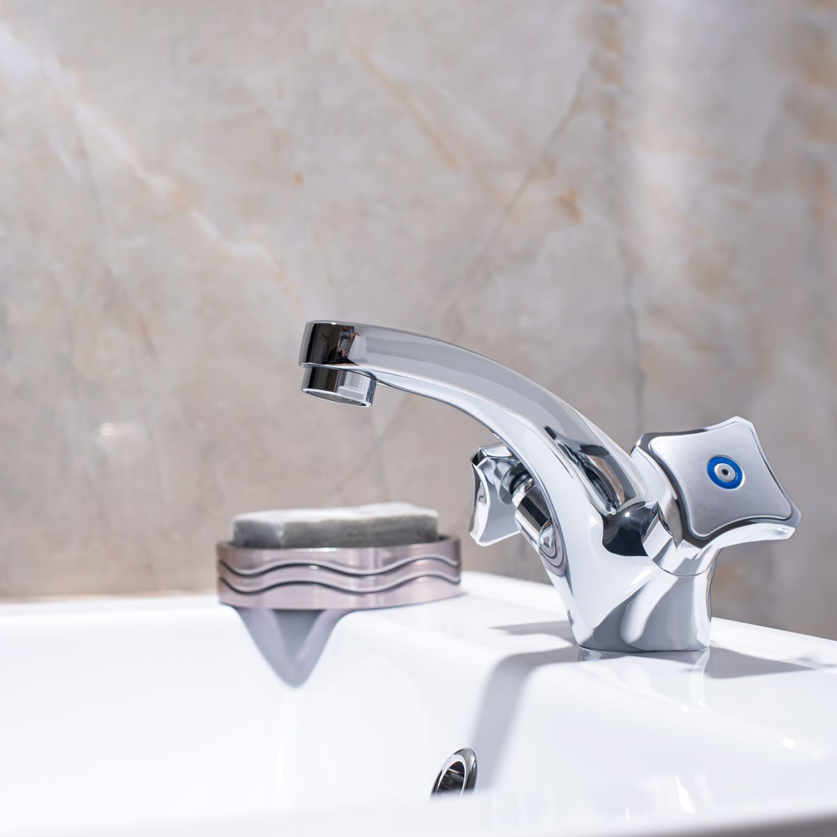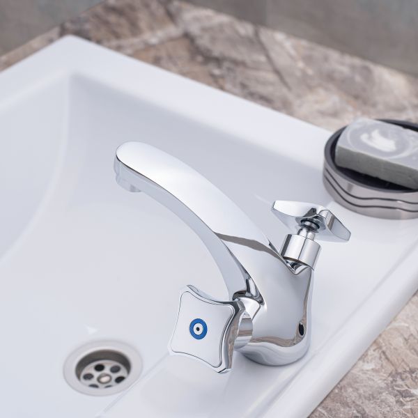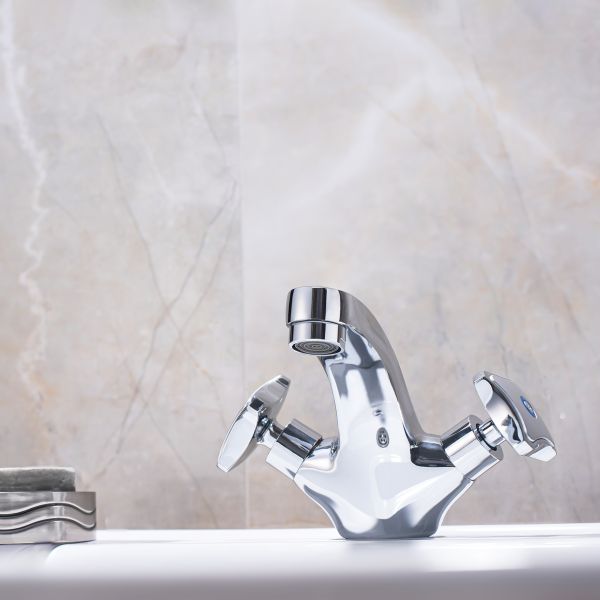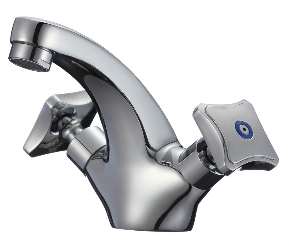 Двуручковый смеситель для умывальника обладает стильным дизайном и удобными в использовании ручками регулирования температуры и напора воды.