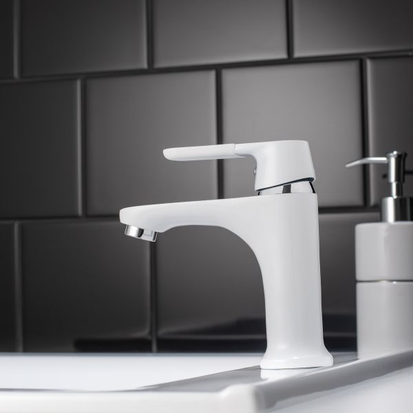 Одноручковый смеситель для умывальника с монолитным коротким изливом выполнен в элегантном белом оттенке и станет стильным элементом интерьера.