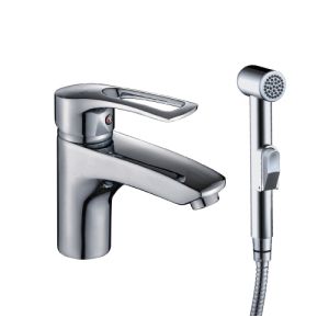 Монолитный смеситель для умывальника и биде Rossinka T40-15, однорычажный. Аксессуары в комплекте (шланг 1,5 м, лейка для биде с нажимным механизмом, настенное крепление для лейки).