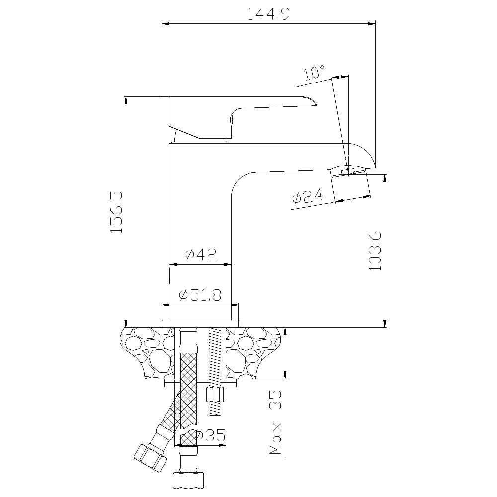Смеситель для раковины Rossinka W35-12 монолитный. Пластиковый аэратор с изменяемым углом подачи воды, керамический картридж 35 мм, гибкая подводка 35 см - 2 шт, присоединительная группа для горизонтального крепления, металлическая рукоятка