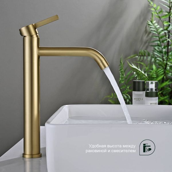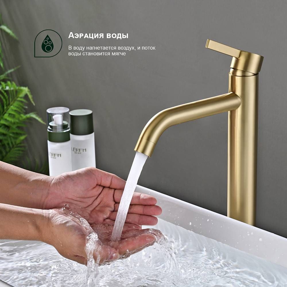 Смеситель выполнен в цвете «золотой сатин», который придаст вашей ванной комнате изысканность и элегантность.
