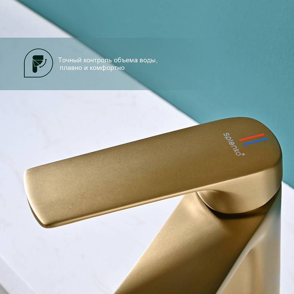 Смеситель для раковины Splenka S30.10.03, сатин золотой. Смеситель для раковины Splenka имеет повышенную прочность корпуса. Соответствует требованиям международного стандарта. Одна рукоять для регулировки воды. Аэратор гарантирует одинаковый поток воды, сеточка рассеивает напор, вода смягчается. Смеситель устанавливается на гайке, нижняя часть смесителя вставляется в отверстие для монтажа и затягивается гайкой для фиксации. Данный смеситель для умывальника имеет надежный стационарный излив, не меняющий своего положении. Смеситель прекрасно смешивает потоки воды, а помимо этого обладает невысоки показателем шумов. Быстрый монтаж. Гарантия производителя 5 лет.