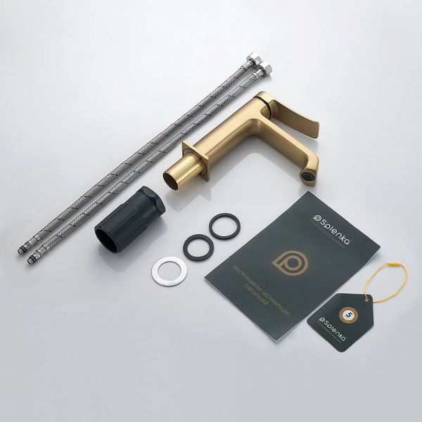 Смеситель для раковины Splenka S31.10.03, сатин золотой. Смеситель для раковины Splenka имеет повышенную прочность корпуса. Соответствует требованиям международного стандарта. Одна рукоять для регулировки воды. Аэратор гарантирует одинаковый поток воды, сеточка рассеивает напор, вода смягчается. Смеситель устанавливается на гайке, нижняя часть смесителя вставляется в отверстие для монтажа и затягивается гайкой для фиксации. Данный смеситель для умывальника имеет надежный стационарный излив, не меняющий своего положении. Смеситель прекрасно смешивает потоки воды, а помимо этого обладает невысоки показателем шумов. Быстрый монтаж. Гарантия производителя 5 лет.