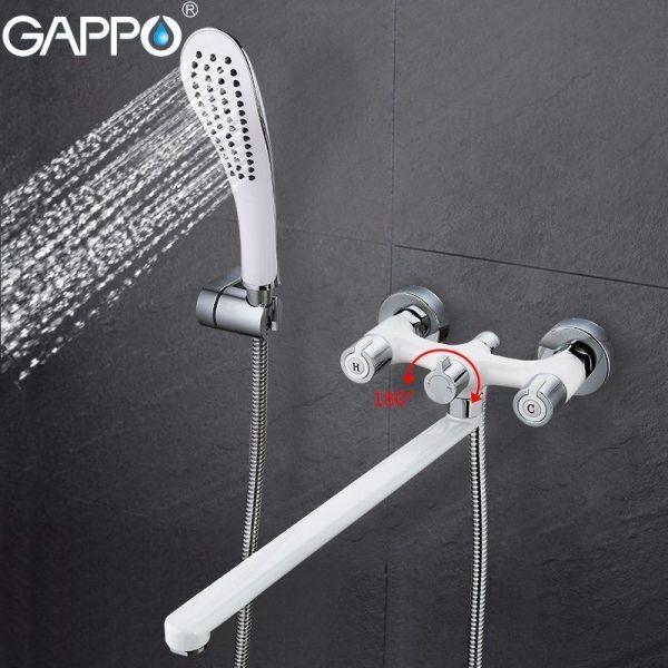 Смеситель для ванны Gappo Stella G2249 - стильная двухвентильная латунная модель с поворотным изливом 35 см. Душевая лейка в комплекте. Цвет - хром / белый.