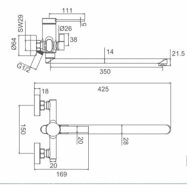 керамический картридж 35 мм; комплектация: смеситель, душевой шланг 150 см, душевая лейка, держатель лейки, комплект отражателей, комплект эксцентриков