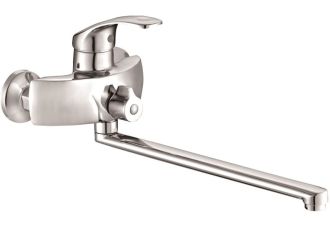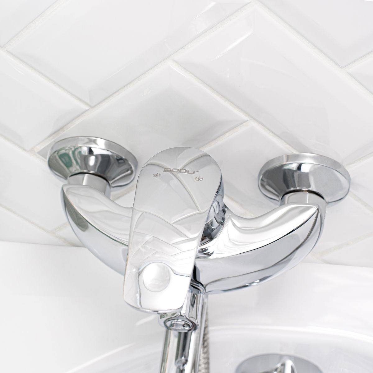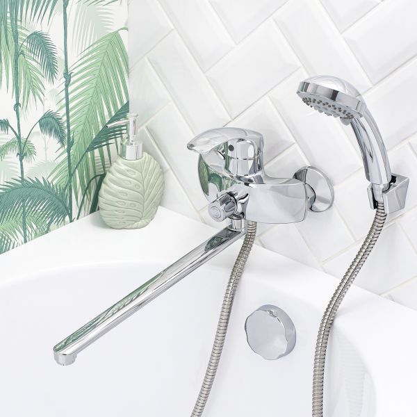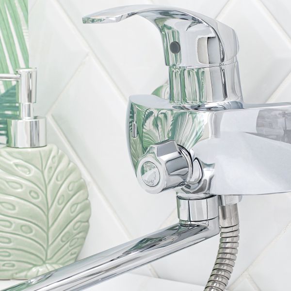 Однорычажный смеситель Торговой марки BOOU обладает современным динамичным ди-зайном корпуса. Модель прекрасно впишется в интерьер современной ванной комнаты. Наличие длинного поворотного излива делает модель универсальной: она используется для обеспечения водой как ванны, так и раковины – актуально в небольшом санузле. В комплек-те удобная трехрежимная лейка с гибким шлангом и настенный держатель.