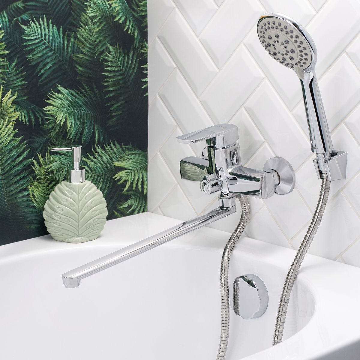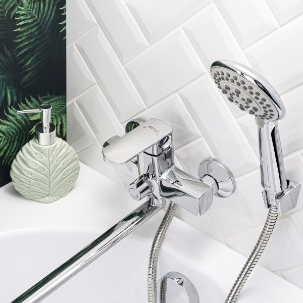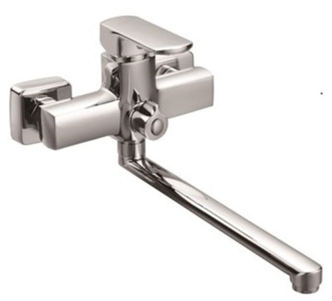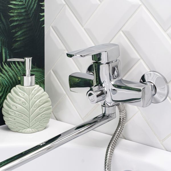 Однорычажный смеситель ТМ BOOU обладает стильными прямоугольными гранями корпу-са. Наличие длинного поворотного излива делает модель универсальной: она используется для обеспечения водой как ванны, так и раковины – актуально в небольшом санузле. В ком-плекте удобная трехрежимная лейка с гибким шлангом и настенный держатель.