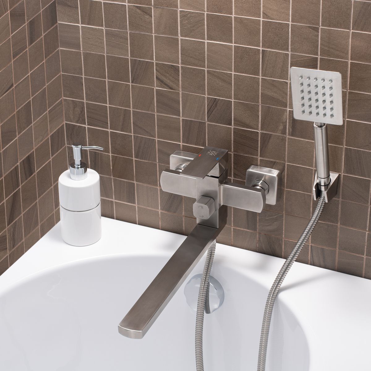 При производстве смесителей ТМ РМС используются только высококачественные материалы. Смесители серии SUS125 выполнены из нержавеющей стали, что является гарантией качества и долговечности, устойчивы к царапинам, экологичны и безопасны для вашего здоровья. Поверхность не потеряет со временем свой роскошный вид, а уход за ней сводится к протиранию мягкой салфеткой. Установка смесителя крайне проста. Смесители РМС это сертифицированный продукт с 7-летней гарантией. В комплекте удобная лейка с гибким шлангом, настенный держатель, эксцентрики и отражатели.