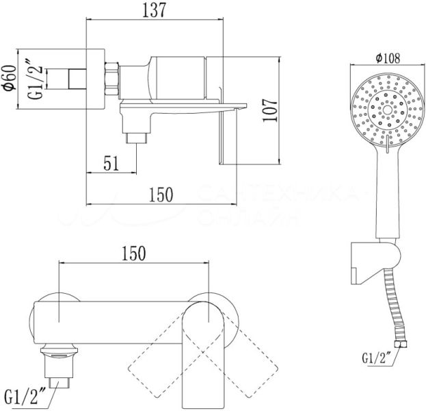Смеситель для ванны с душем Savol S-601808H черный купить