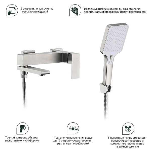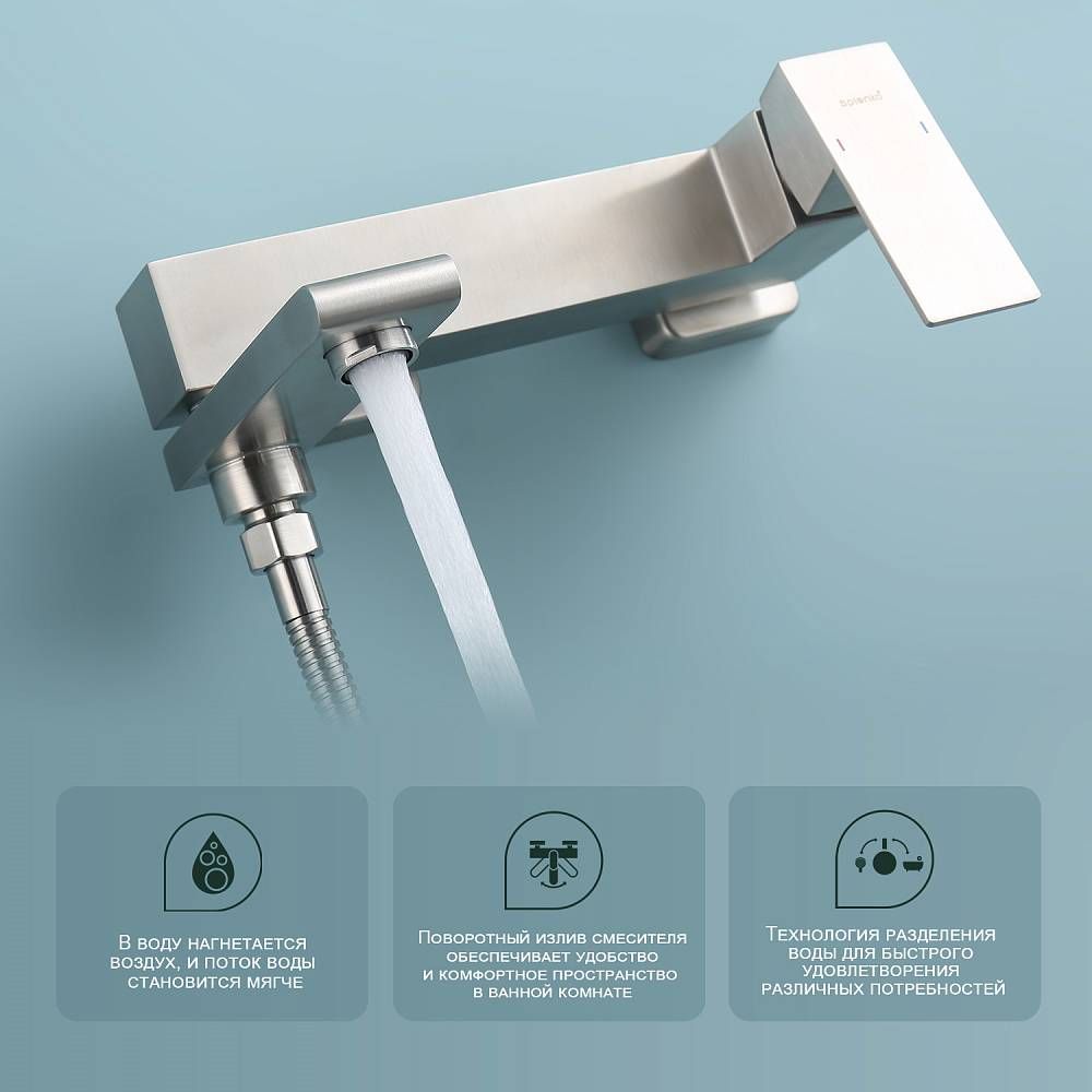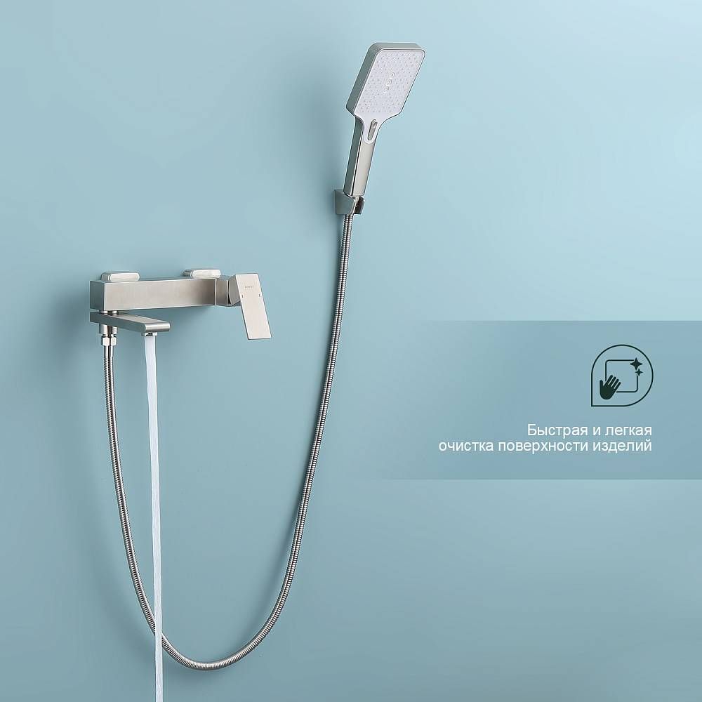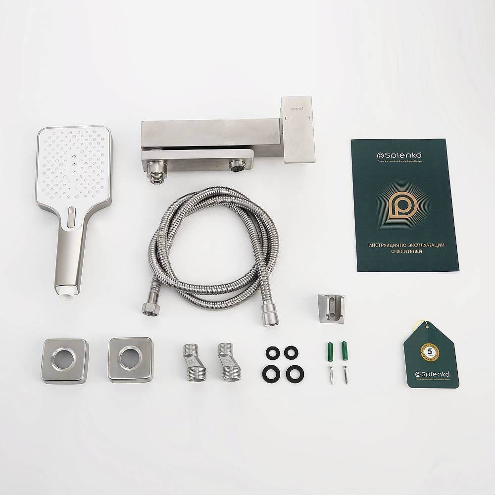 Смеситель для ванны Splenka S224.30.05 с душевым гарнитуром. Цвет: сатин. Материал: латунь. Управление: однорычажное. Механизм: керамический картридж. Излив: поворотный. Аэратор. Стандарт подводки: G 1/2. Отверстия для монтажа: 2. Количество режимов струи: 3. Монтаж: на стену.