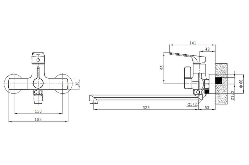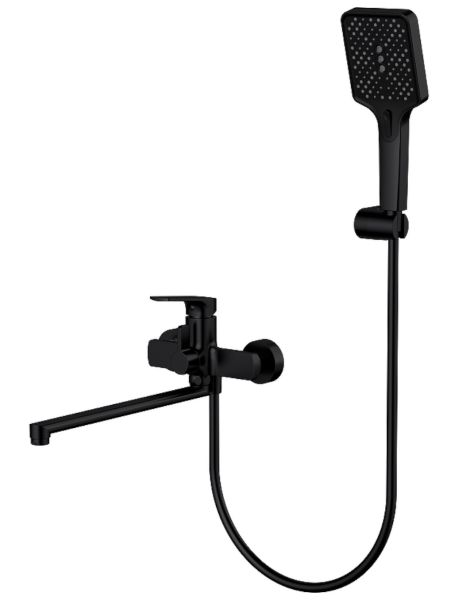 Смеситель для ванны Splenka S30.22.06 универсальный. Цвет: черный. Материал: латунь. Управление: однорычажное. Механизм: керамический картридж. Излив: поворотный. Стандарт подводки: G 1/2. Аэратор. Переключатель ванна/душ. Монтаж: на стену. Душевая лейка - 3 режима.