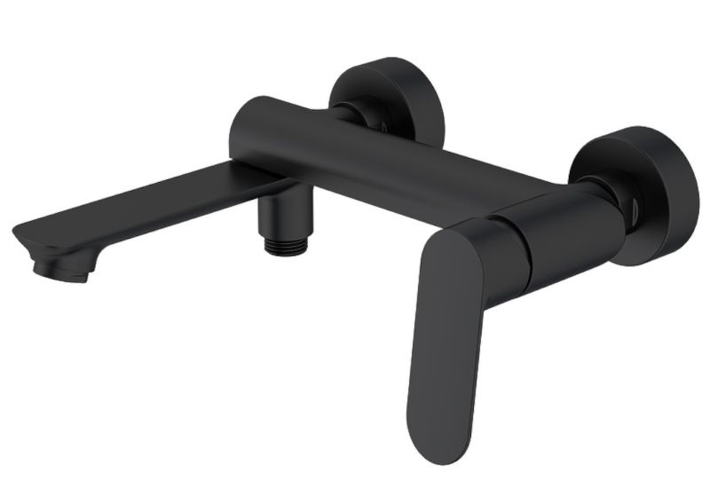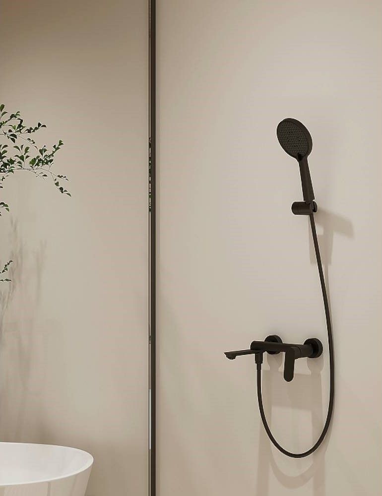 Смеситель для ванны Splenka S41.30.06. Цвет: черный. Материал: латунь. Управление: однорычажное. Механизм: керамический картридж. Излив: поворотный. Аэратор. Стандарт подводки: G 1/2. Отверстия для монтажа: 2. Монтаж: на стену. Душевая лейка - 3 режима.