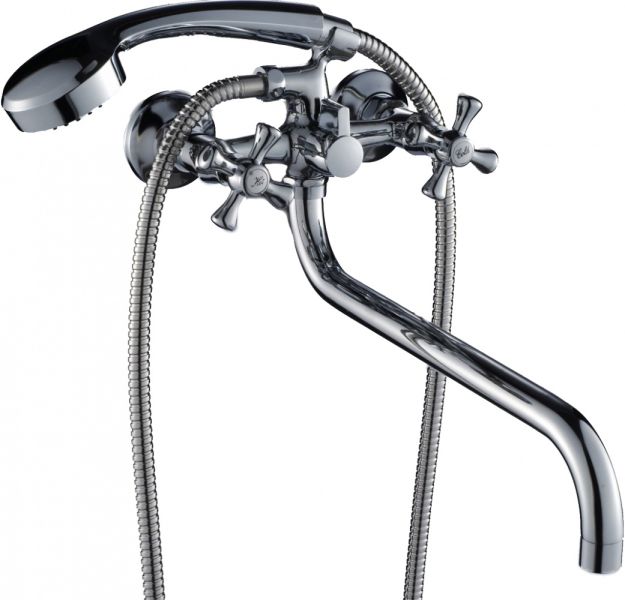 Двухвентильный смеситель для ванны и душа, оснащенный поворотным изливом и душевым набором (душевая лейка, шланг 1500 мм., держатель на корпусе смесителя). Изделие снабжено долговечными керамическими кран-буксами, благодаря чему срок службы смесителя измеряется десятилетиями. Аэратор предотвращает разбрызгивание воды, делая струю мягкой. Модель из пищевой латуни с хромовым покрытием отличается повышенной прочностью и износостойкостью.