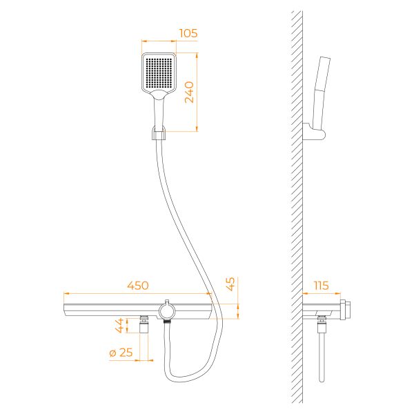 - Ручной душ на гибком шланге из ПВХ длиной 1.5 м, с тремя режимами струи, изготовленный из устойчивого к износу ABS-пластика;