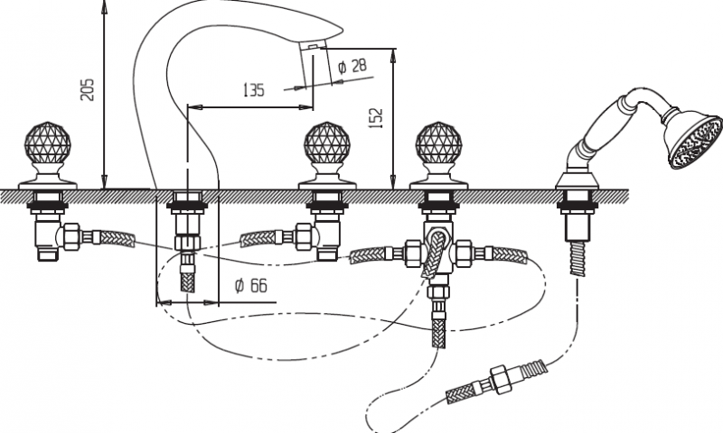 Оснащение: душевой шланг, душевая лейка, крепления, аэратор, дивертор