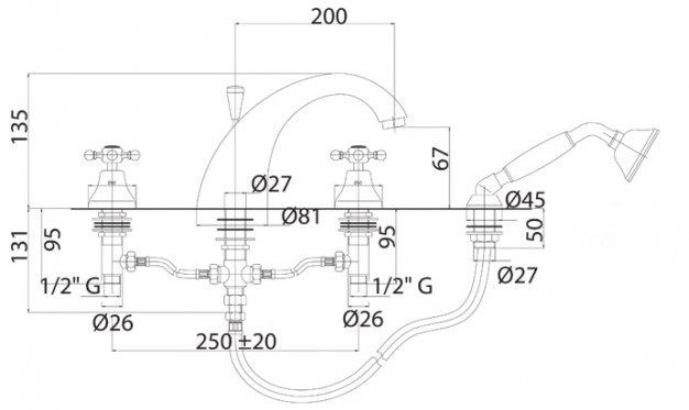 Смеситель на борт ванны с ручным выдвижным душем, золото Cezares GOLF-BVD-03/24-Bi купить