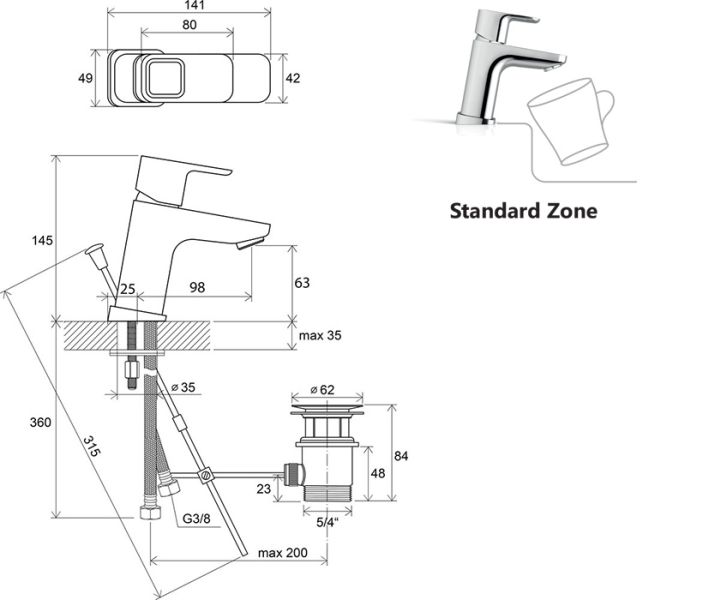 - высота смесителя: 140 мм - стандартный