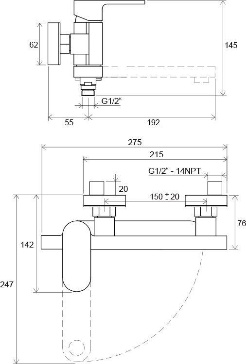 - межосевой размер смесителя : 150 мм