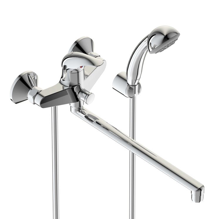 ORION Однорукоятковый настенный смеситель для ванны/душа, поворотный излив 320 мм, душевой гарнитур в комплекте (душевая лейка Ø70 мм, металлический шланг 1500 мм, держатель для лейки).