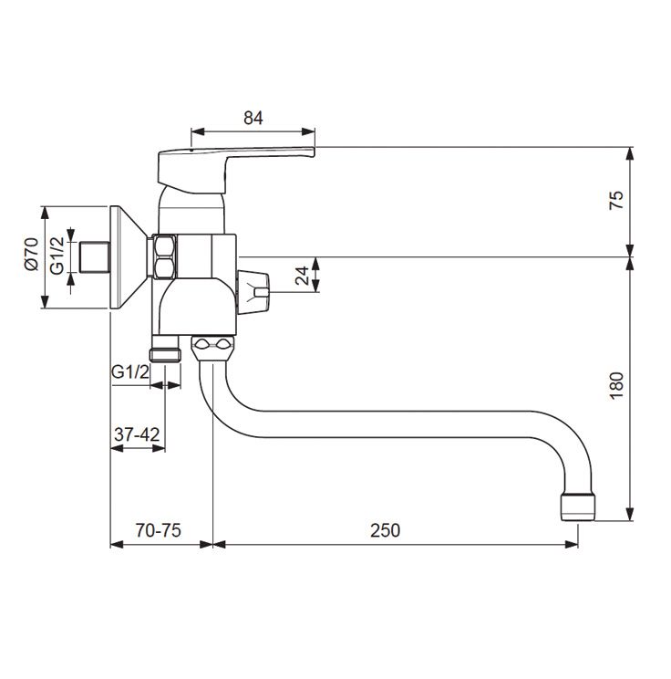 UNO Настенный смеситель для ванны/душа, поворотный излив 250 мм, душевой гарнитур в комплекте (душевая лейка 70 мм, металлический шланг 1500 мм, держатель для лейки).Смеситель однорычажный