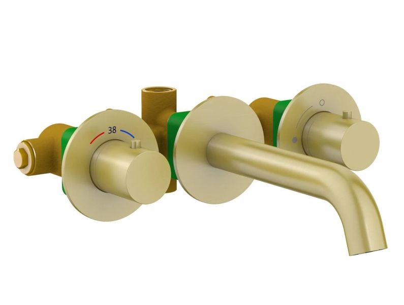 Цвет "матовое золото" никогда не выйдет из моды, во все времена драгоценный металл был признаком богатства. Встраиваемый смеситель Timo Saona 2381 предназначен для монтажа в твердой или полой стене. Основные преимущества встроенного смесителя: коммуникации, крепления и механизмы спрятаны в стену и видны только декоративные элементы, установить встроенный смеситель можно в любом месте. В смесителе установлен термостатический картридж для поддержания стабильной температуры воды. Регулировка температуры воды осуществляется ручкой термостата расположенной слева. Подача воды и увеличение напора осуществляется поворотом ручки расположенной справа. Сложностей монтажа не возникает при установке смесителя опытным сантехником. Внимательно изучите инструкцию по монтажу и эксплуатации.