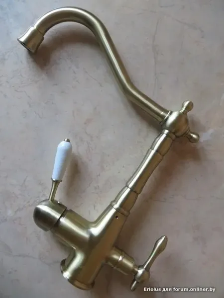 Cмеситель для кухонной мойки Gappo G4391-4 с подключением фильтра питьевой воды - однорычажный смеситель в ретро-стиле, с высоким поворотным изливом и отдельным краном для фильтрованной воды. Изделие изготовлено из латуни с отделкой "бронза". Подключается к системе очистки воды.