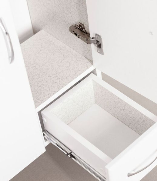 Тумба напольная бренда "Style Line" Эко Стандарт 10 с 1 ящиком. Фурнитура - хром, эксклюзивный декор "Луино" - ламинация внутренней стороны изделия. Направляющие полного выдвижения Hettich; сборка изделия с помощью эксцентриковых стяжек Hafele; все материалы полностью влагостойкие. Данная тумба предусматривает открытую подводку воды
