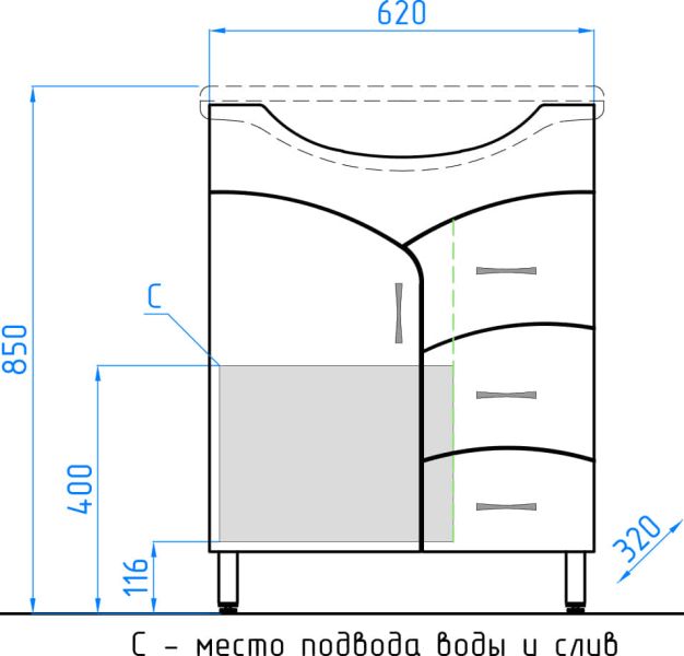 Тумба напольная бренда "Style Line" Эко Стандарт 22 с 3 ящиками. Фурнитура - хром, эксклюзивный декор "Луино" - ламинация внутренней стороны изделия. Направляющие полного выдвижения Hettich; сборка изделия с помощью эксцентриковых стяжек Hafele; все материалы полностью влагостойкие. Данная тумба предусматривает открытую подводку воды