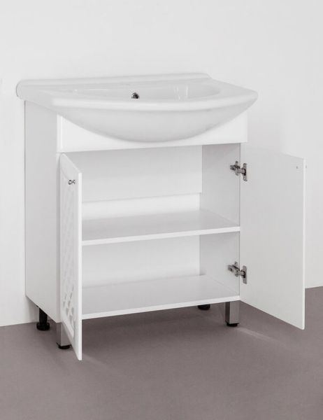 Тумба напольная бренда "Style Line" коллекции "Канна" с современной 3D фрезеровкой фасада, которая придает мебели индивидуальность и особый колорит. Фурнитура - хром, петли на дверцах с механизмом плавного закрывания. Направляющие полного выдвижения Hettich обеспечивают плавность и бесшумность хода, высокую надежность и прочность. Данная тумба предусматривает открытую подводку воды. Боковины изделий в пленке в цвет фасадов