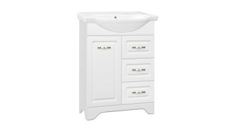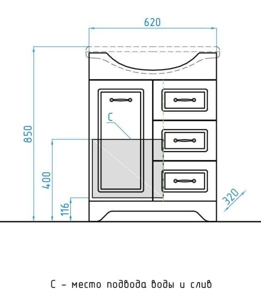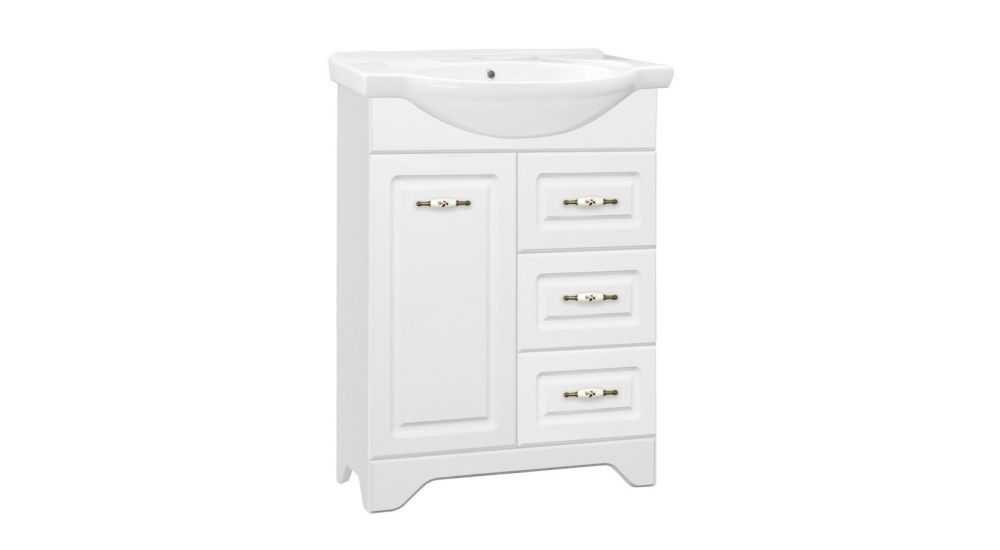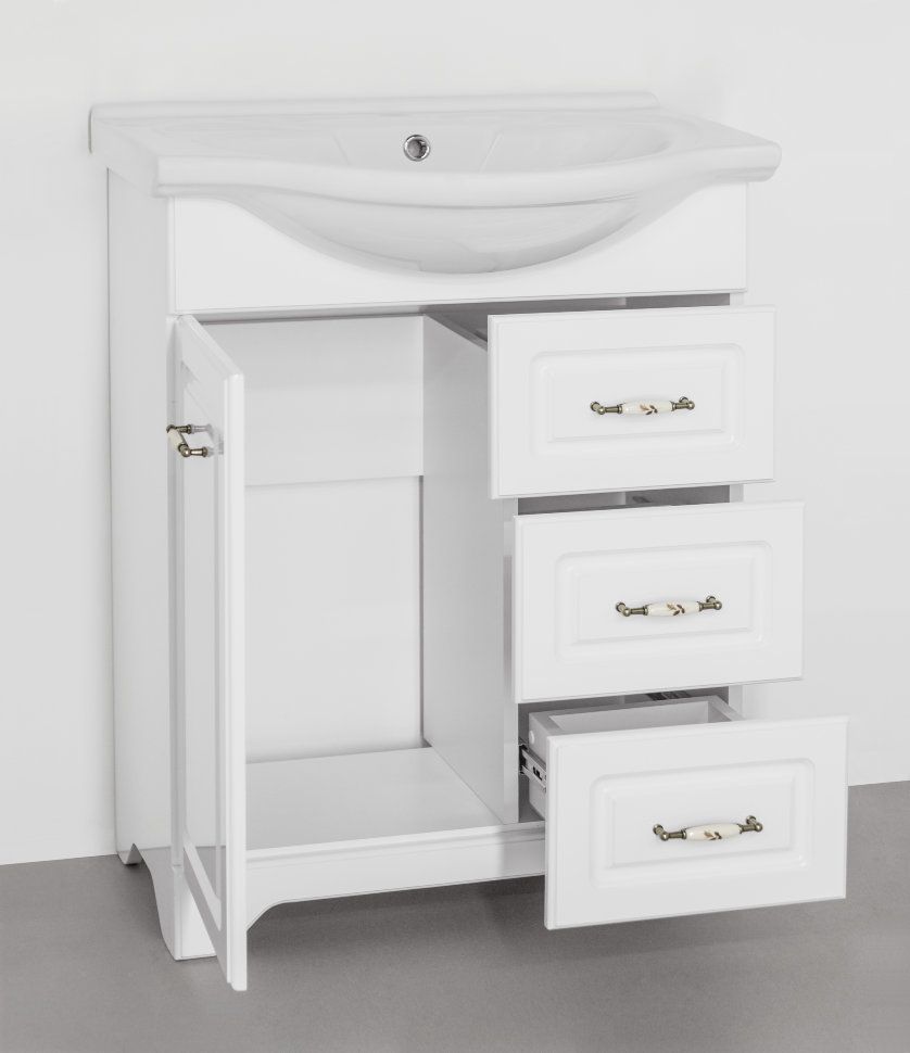 Тумба напольная бренда "Style Line" коллекции "Олеандр-2" классического дизайна, декорированная ручками с керамическими вставками "под бронзу" с изящным рисунком. Направляющие полного выдвижения Hettich; сборка изделия с помощью эксцентриковых стяжек Hafele; все материалы полностью влагостойкие. Данная тумба предусматривает открытую подводку воды