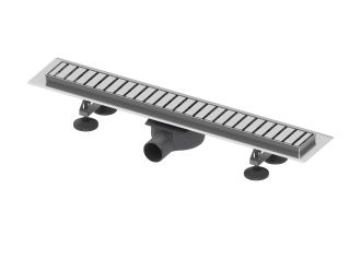 Комплект поставки: • дренажный канал из нержавеющей стали; • cифон DN 50, выход вбок, производительность (согласно DIN EN 1253) при уровне воды 10/20 мм над решеткой: 0,7/0,8 л/с; уровень гидрозатвора = 25 мм согласно DIN EN 1253; • гидроизоляционная манжета; • погружной стакан с мембраной; • 4 опоры, высота до 125 мм (до уровня чистового пола); • декоративная решетка “straight” Внимание! Минимальная высота монтажа 95 мм (от чернового пола до уровня чистового покрытия)