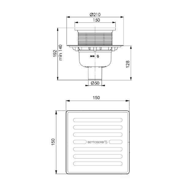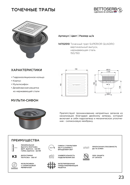 Трап с мульти-сифоном BETTOSERB 14702510 Superior Quadro 15х15 вертикальный выпуск