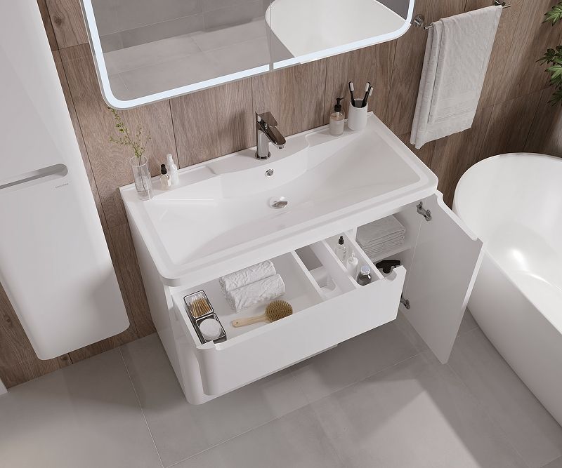 Тумба под раковину Grossman Адель 90 в белом глянцевом цвете, интегрированные ручки добавляют современный дизайн и строгий стиль. Тумба снабжена двумя ящиками и дверцей, укомплектованые системой плавного закрывания и предназначены для хранения различных предметов.Тумба выполнена из влагостойкого МДФ покрытая белой глянцевой краской, устойчивая к перепадам температур и высокой влажности, крепится к стене.Ручки и подвесы для крепления тумбы - в комплекте.Раковина Aдель-90 приобретается отдельно.Цвет: белый.