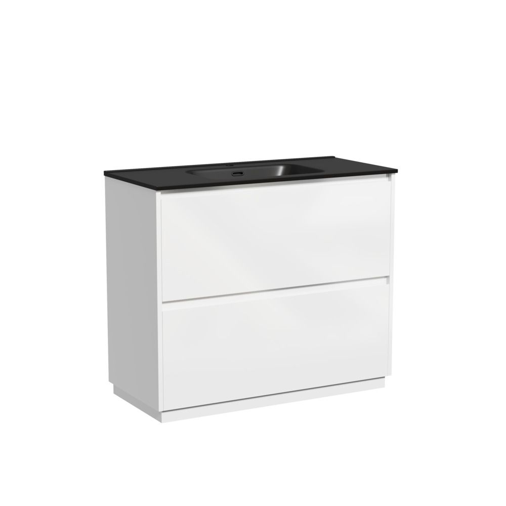 Тумба напольная Libra c двумя ящиками с доводчиками скрытого монтажа, с системой плавного закрывания и с ручкой по всей длине ящика. Каркас и фасад тумбы выполнен из МДФ, покрытие эмаль, цвет белый глянец. Основание тумбы имеет ножки c регулировкой высоты до10 мм для компенсации возможной неровности напольного покрытия. Внутреннее пространство тумбы выполнено из надежного ЛДСП серого цвета. Размер 990х450х840, артикул LB100FW.