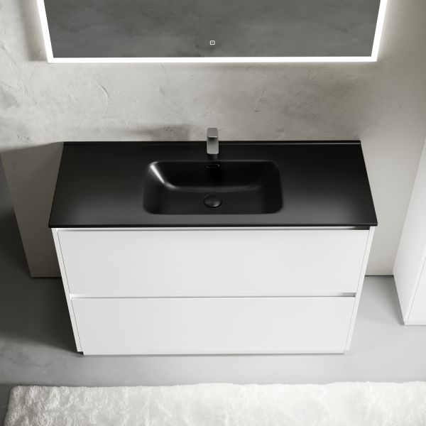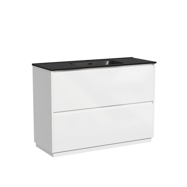 Тумба напольная Libra c двумя ящиками с доводчиками скрытого монтажа, с системой плавного закрывания и с ручкой по всей длине ящика. Каркас и фасад тумбы выполнен из МДФ, покрытие эмаль, цвет белый глянец. Основание тумбы имеет ножки c регулировкой высоты до10 мм для компенсации возможной неровности напольного покрытия. Внутреннее пространство тумбы выполнено из надежного ЛДСП серого цвета. Размер 1190х450х840, артикул LB120F-1W Для черной