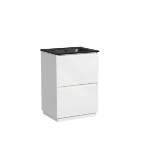 Тумба напольная Libra c двумя ящиками с доводчиками скрытого монтажа, с системой плавного закрывания и с ручкой по всей длине ящика. Каркас и фасад тумбы выполнен из МДФ, покрытие эмаль, цвет белый глянец. Основание тумбы имеет ножки c регулировкой высоты до10 мм для компенсации возможной неровности напольного покрытия. Внутреннее пространство тумбы выполнено из надежного ЛДСП серого цвета. Размер 590х450х840, артикул LB60FW.