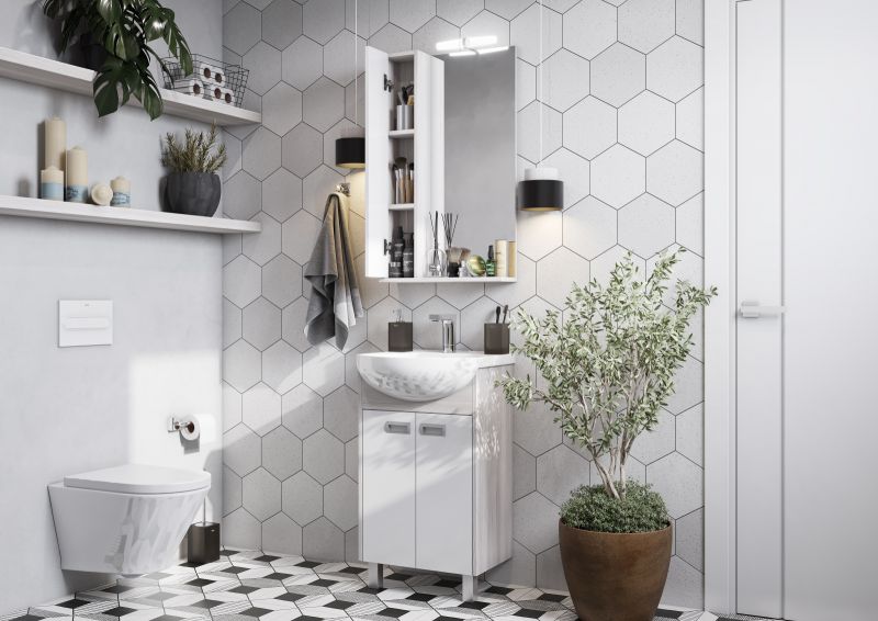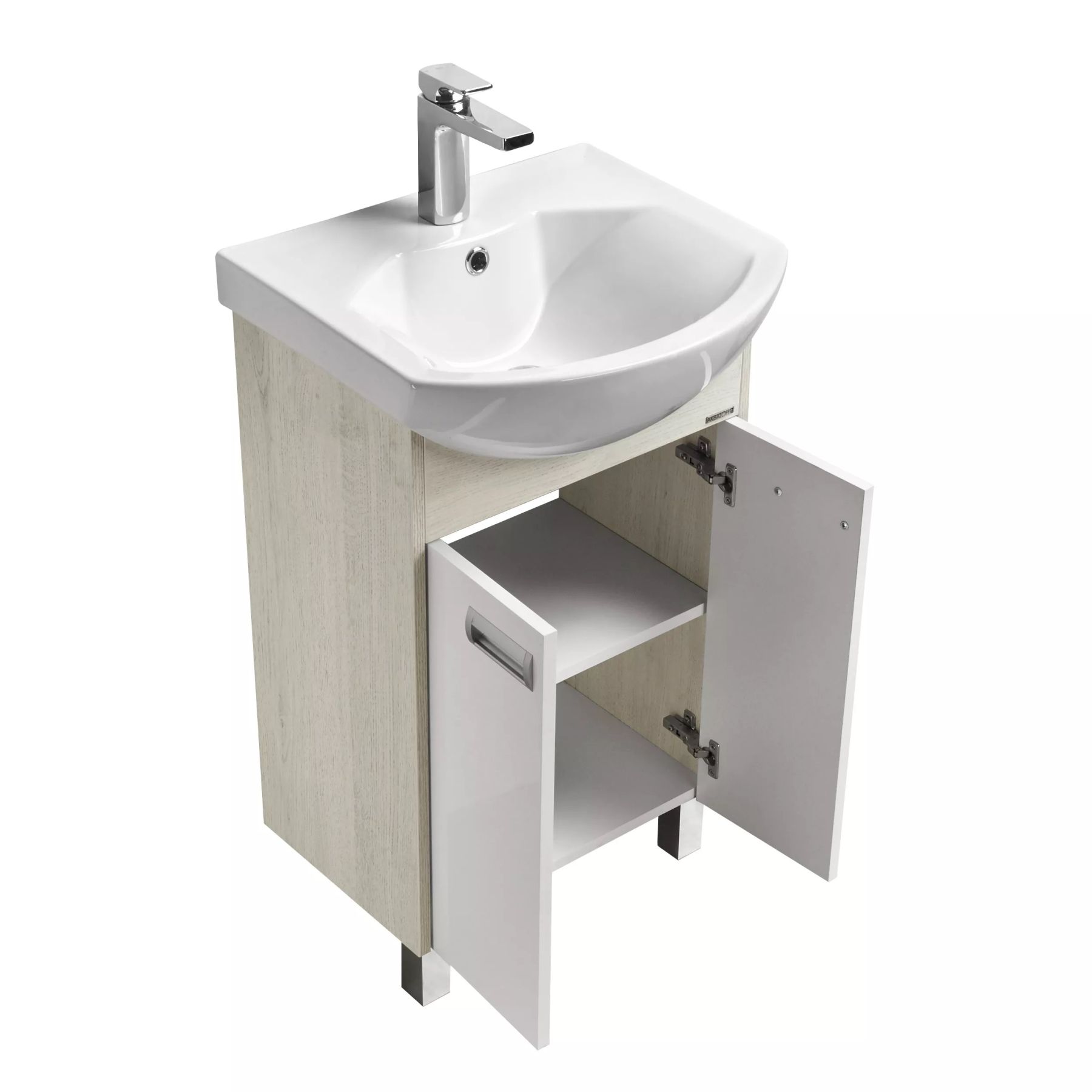 Компактная тумба в размере 50 включает в себя два фасада-створки, петли с доводчиками и регулируемую по высоте полку. Тумбы установлены на металлические ножки и укомплектованы практичными врезными ручками, которые очень удобны в использовании. Боковые стенки и фигурная планка под раковиной изготовлены из ламинированной, текстурированной влагостойкой ЛДСП в цвете дуб сомерсет, а фасады - из крашеной в белый цвет влагостойкой ЛДСП