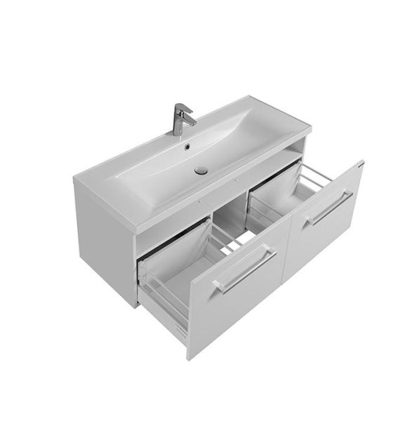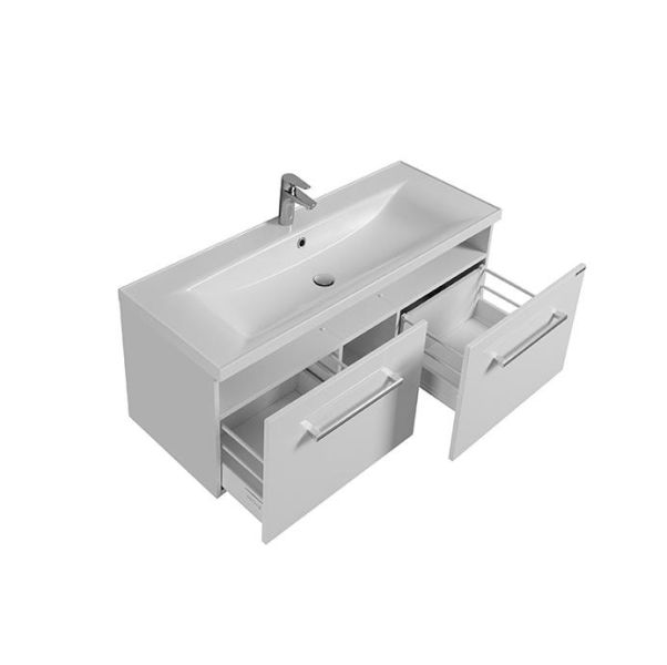 Центром коллекции является тумба, которая комплектуется раковиной из литого мрамора. Тумба выпускается с выдвижным ящиком, оснащенным системой плавного закрывания и антискользящим ковриком. Тумба дополнительно оснащена полочками с рейлингом, расположенными над ящиком.