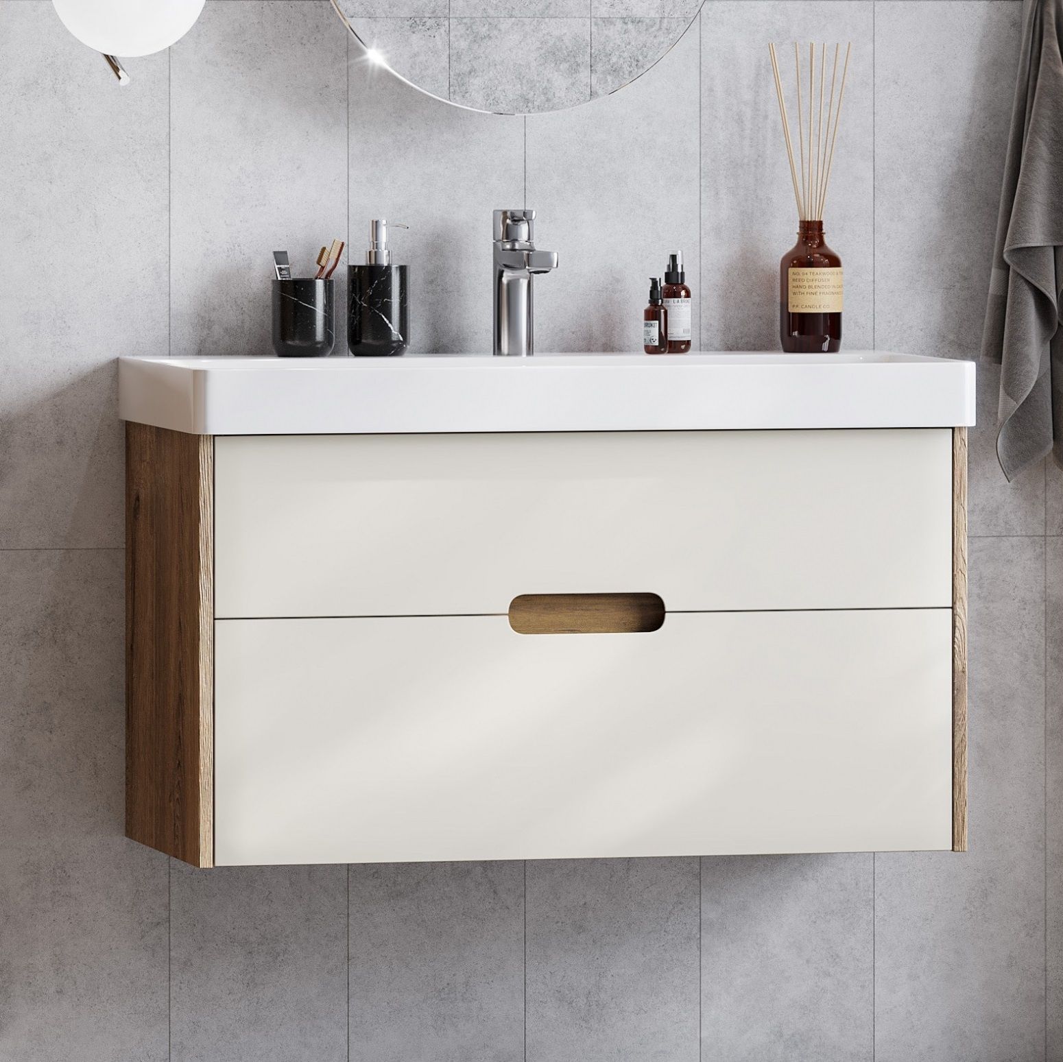 Тумба для комплекта Акватон Оливия 90 бежевый/дуб велл не только не только функциональный предмет интерьера ванной комнаты, но бесподобное эргономичное дополнение дизайна, как небольшого, так и крупного помещения. Подвесной способ установки дает возможность не только визуально увеличить пространство, но и обеспечивает быстрый и удобный доступ для уборки.Компания Акватон использует при производстве высококачественные водоотталкивающие материалы (ДСП), соответствующие всем необходимым требованиям безопасности. Серия Оливия отличается превосходным дизайном с соблюдением всех актуальных элементов современного стиля. Основным цветом, в котором выполнена тумба под раковину Акватон Оливия является светлое дерево, отлично подходящий большинству дизайнерских решений. Тумба под раковину предусматривает удобную и вместительную систему хранения, состоящую из ящиков. Ключевые габариты изделия: ширина 88.2 см, глубина 42.7 см, высота 48 см.Страной бренда Акватон является Россия, все товары производятся с выполнением соответствующих стандартов качества, что позволяет быть полностью уверенными в долговечности и надежности. Тумба для комплекта Акватон Оливия 90 бежевый/дуб велл правильный выбор в современном дизайне ванной, придающий уникальность всему помещению, при этом сохраняя функциональность.