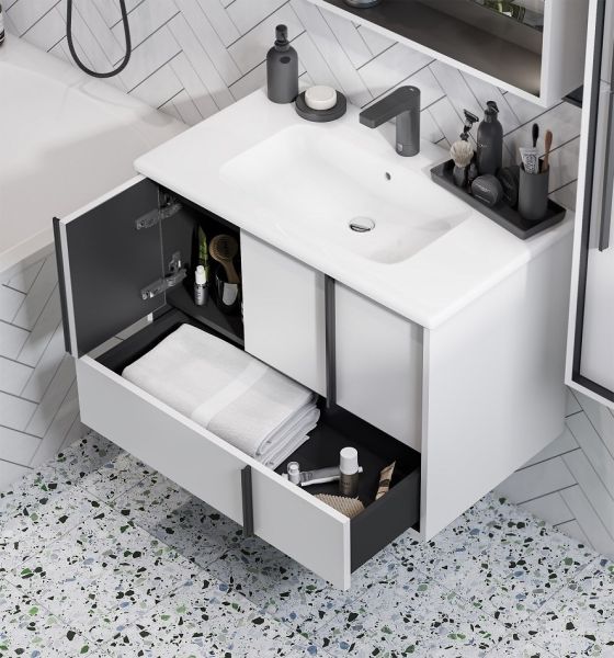 Тумба для комплекта Акватон Ривьера 60 роскошно подойдет как для просторной ванной комнаты, так и для небольшого помещения. Подвесной способ установки дает возможность не только визуально увеличить пространство, но и обеспечивает быстрый и удобный доступ для уборки.В производстве используют только качественные влагостойкие материалы (МДФ), в составе которых полностью отсутствуют опасные вещества. Серия Ривьера отличается превосходным дизайном с соблюдением всех важных элементов современного стиля. Основным цветом, в котором выполнена тумба под раковину Акватон Ривьера является белый, гармонирующий с большинством интерьерных решений. Тумба под раковину предусматривает удобную и вместительную систему хранения, состоящую из дверей, ящиков. Важные размеры товара: ширина 78.6 см, глубина 45 см, высота 55 см.Страной бренда Акватон является Россия, все товары производятся с выполнением соответствующих стандартов качества, что позволяет быть полностью уверенными в долговечности и надежности. Тумба для комплекта Акватон Ривьера 60 поможет сделать уютным любой интерьер и создать идеальную ванную комнату.