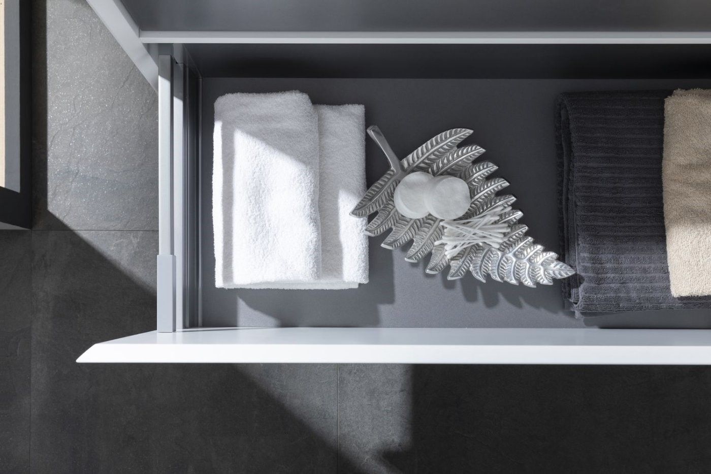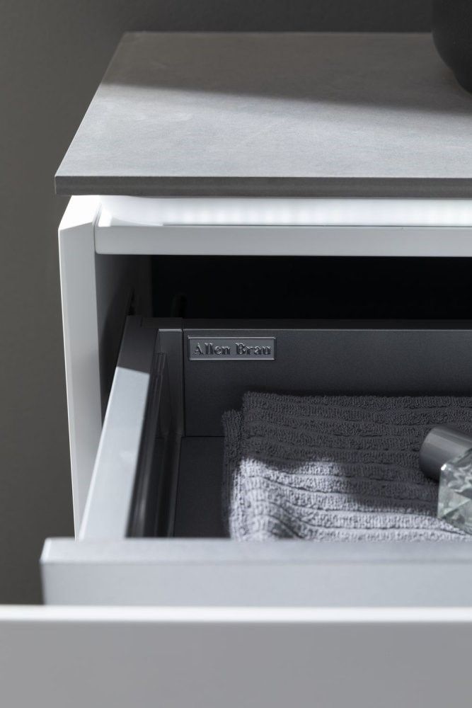 • Выдвижные ящики с металлическими боковыми стенками в цвете серый металлик.